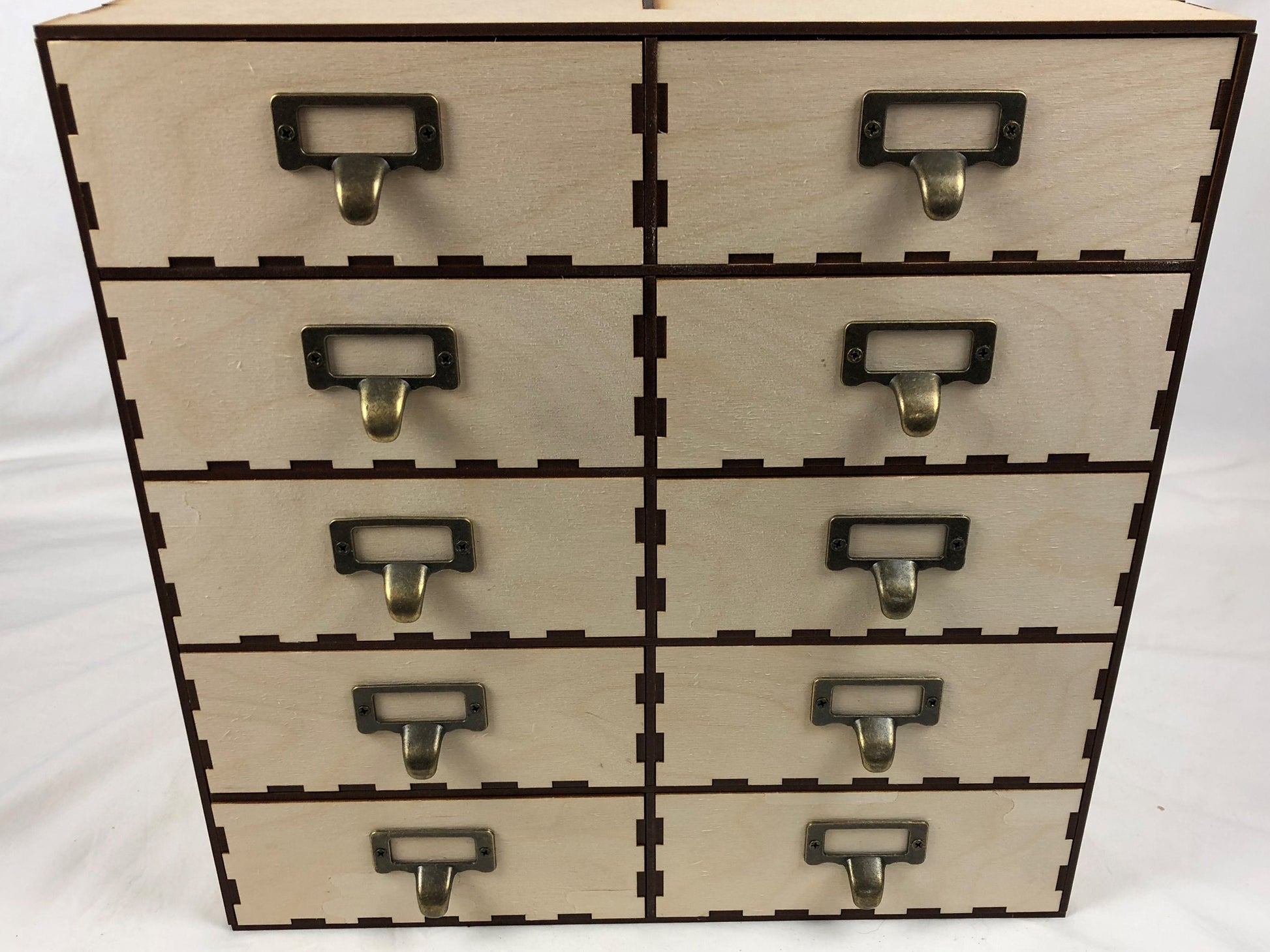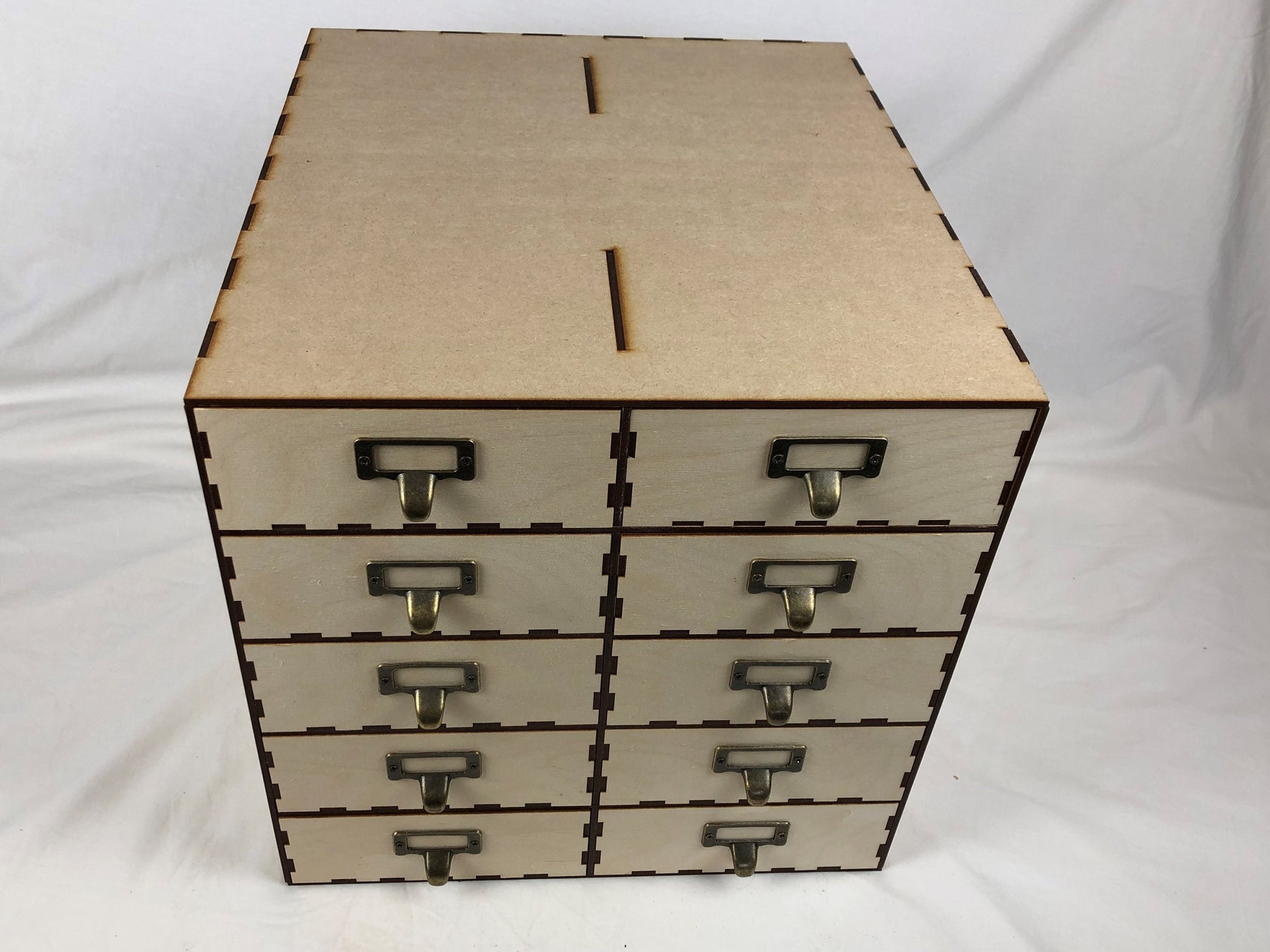 This cabinet is made mostly of High-Quality Medite 3mm MDF (The Best brand available). The Front of each Drawer is made of 3mm Birch Plywood, and comes with 10 metal antique drawer label handles.
