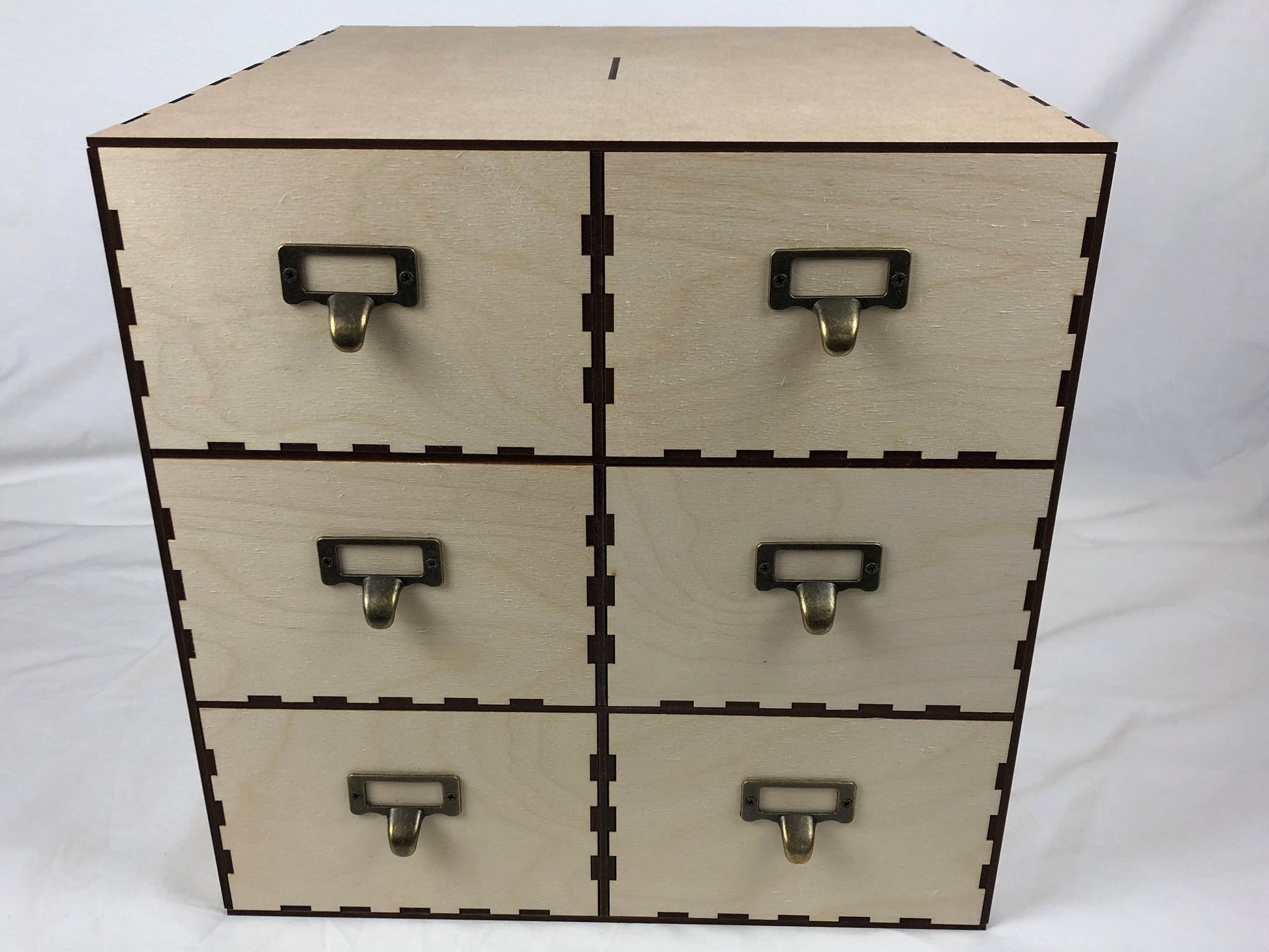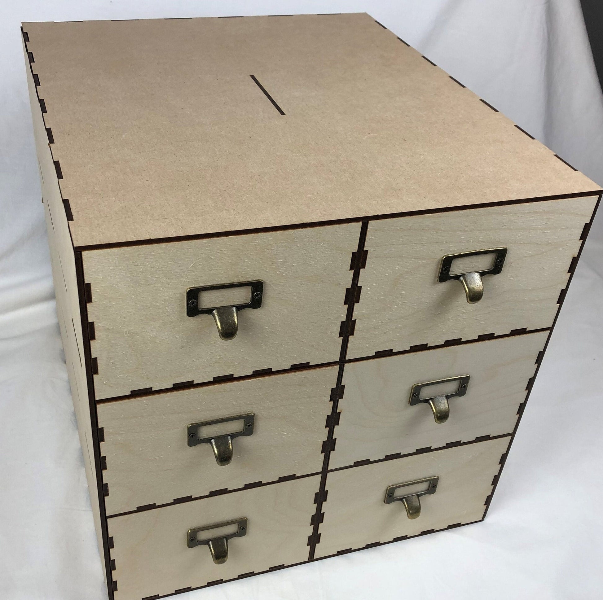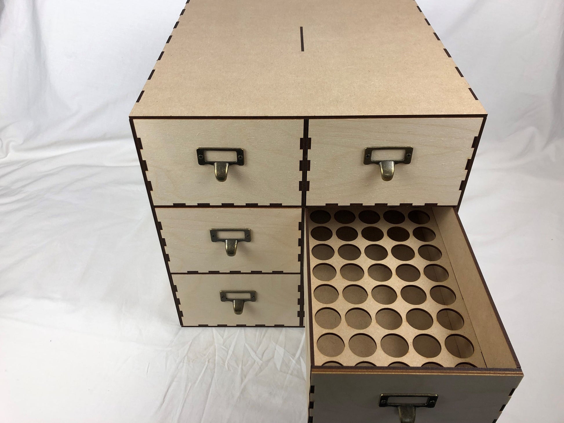 This cabinet is made mostly of High-Quality Medite 3mm MDF (The Best brand available). The Front of each Drawer is made of 3mm Birch Plywood, and comes with 10 metal antique drawer label handles.