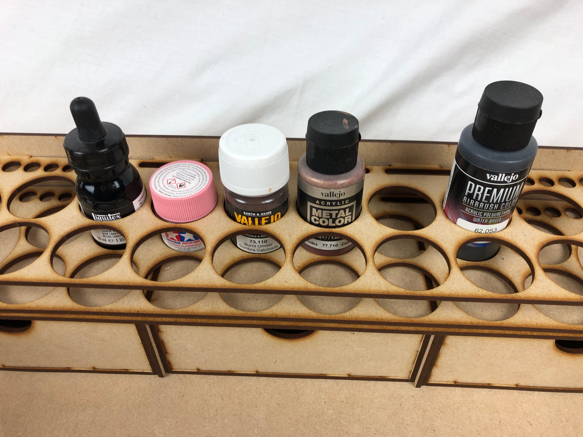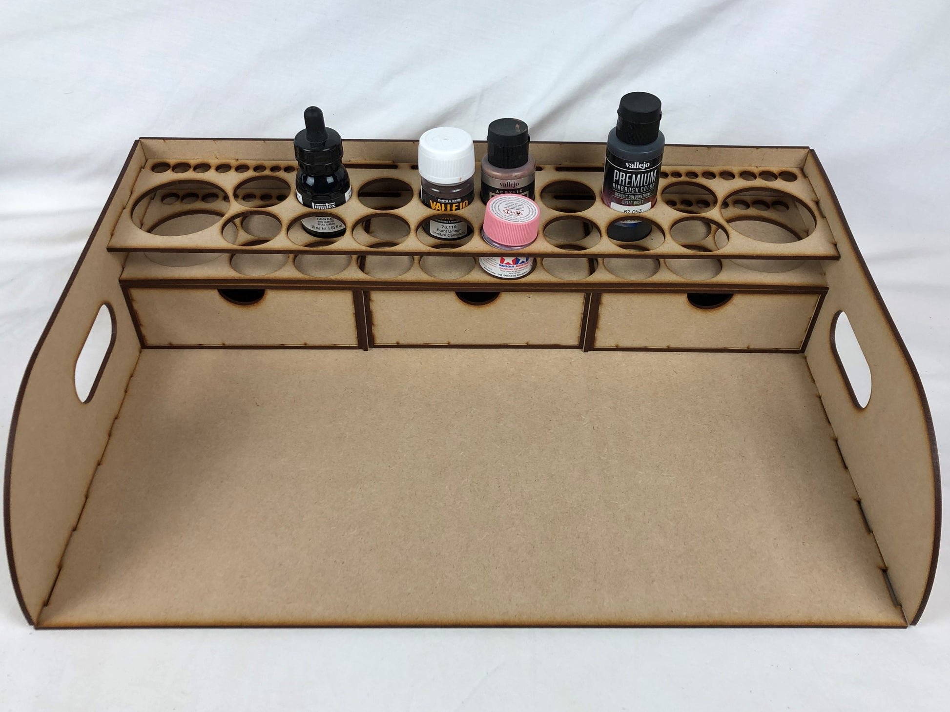 The workstation has room for 2 water pots, various sized paint brushes/ tools and also has 3 good sized drawers, to hold paint, glue or even models. and can hold 16 Ak interactive paints or any standard 36mm dropper bottles.