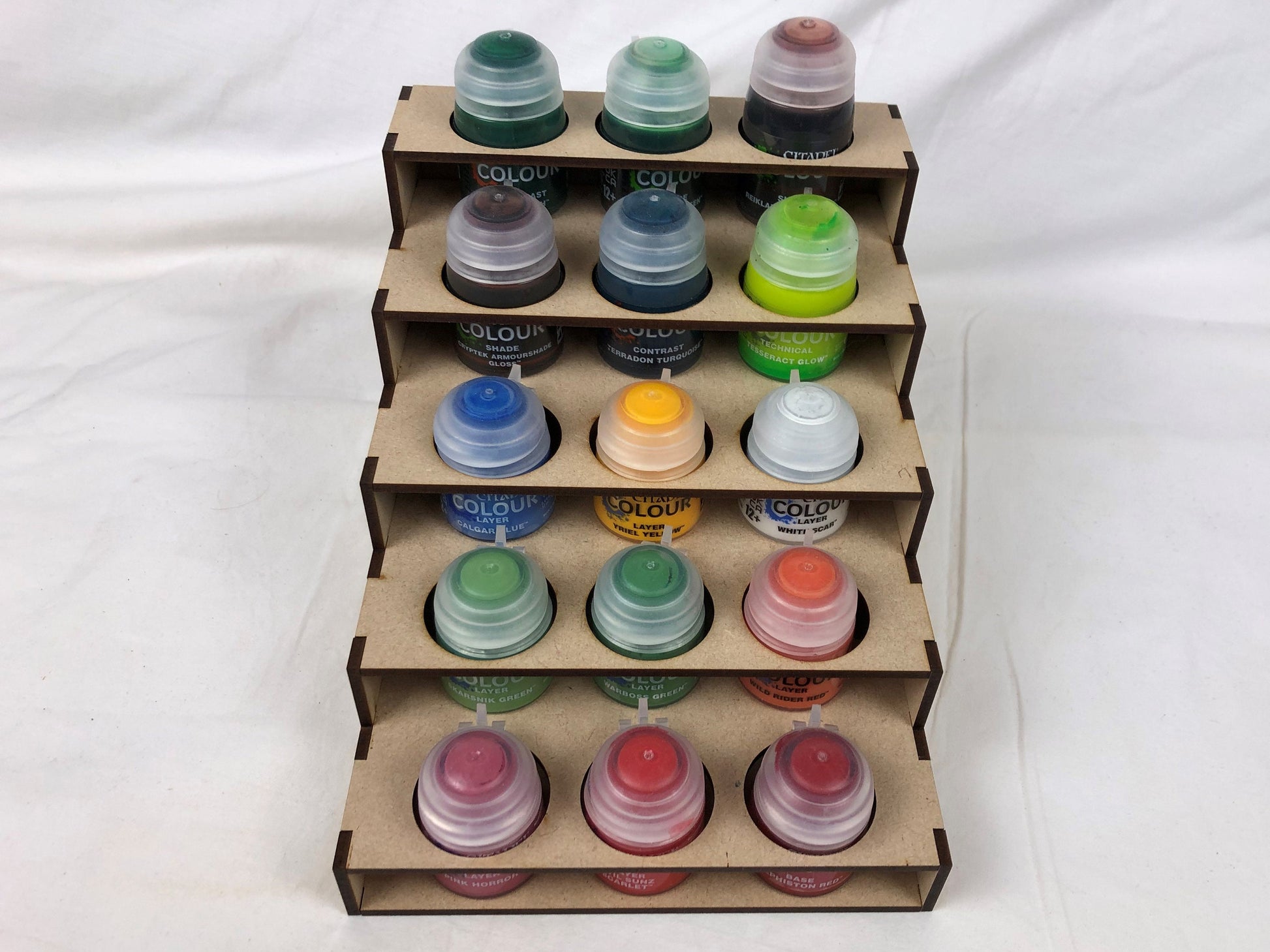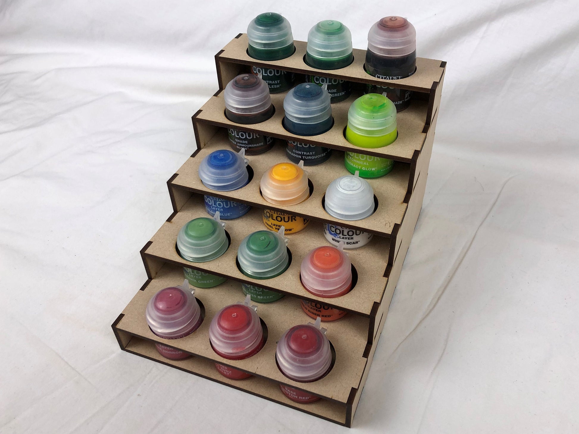 Citadel half size 5-tier paint stand. Perfectly designed to hold 15 Citadel paints. This stand is exactly half the width of our normal 5 Tier paint stands and all the other stands in our modular desk set, to allow greater use of your work area.