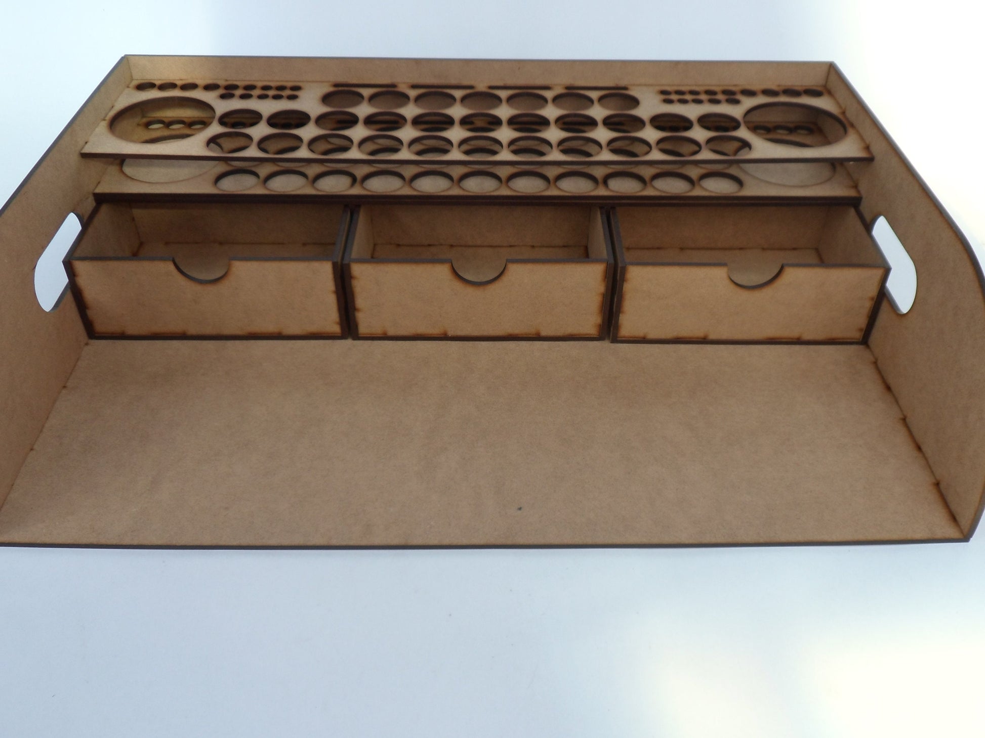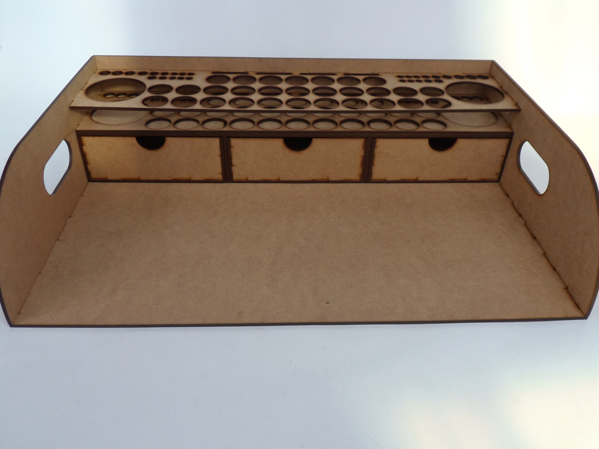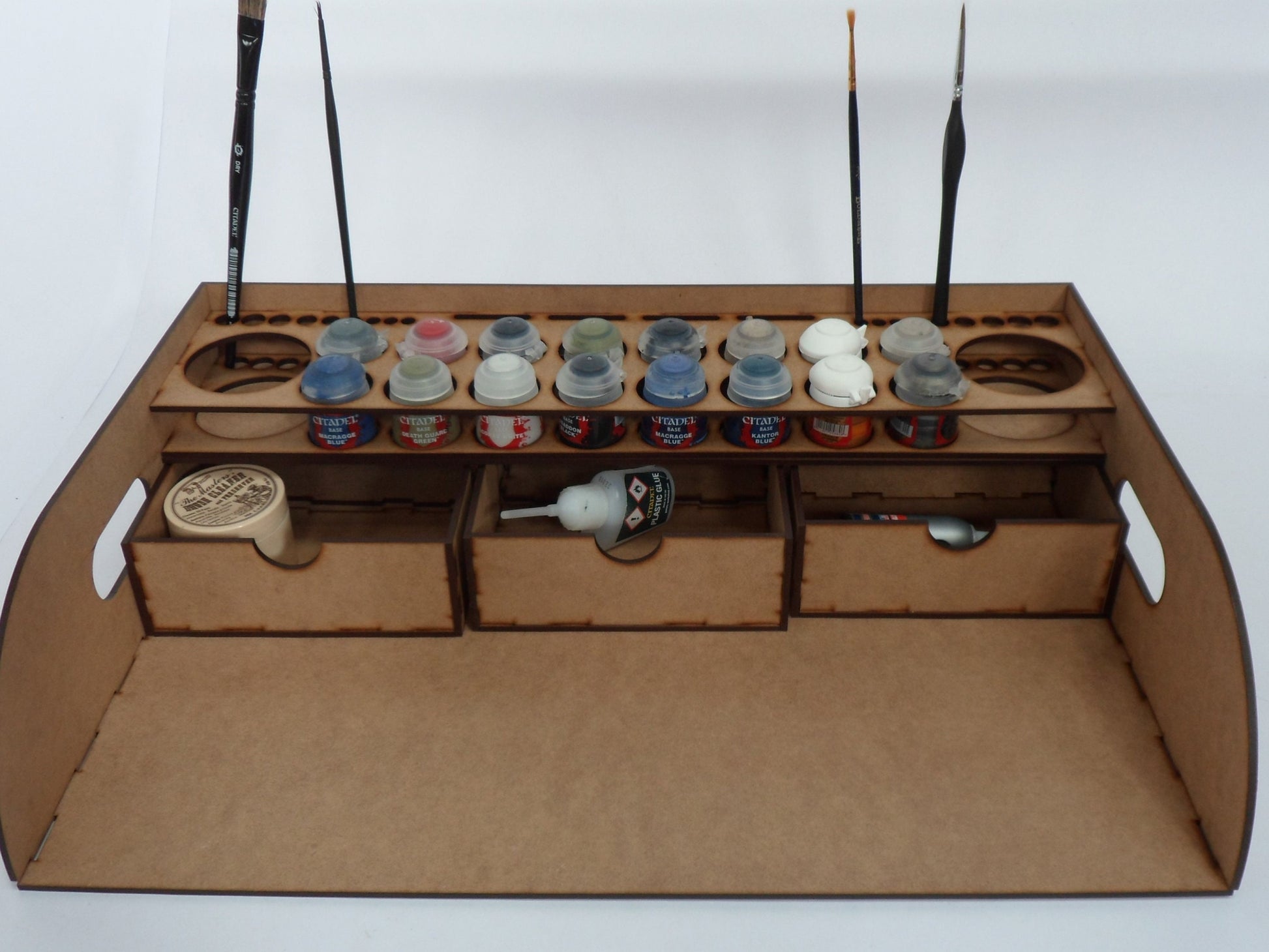 The workstation has room for 2 water pots, various sized paint brushes/ tools and also has 3 good sized drawers, to hold paint, glue or even models. and can hold 16 Citadel paints.