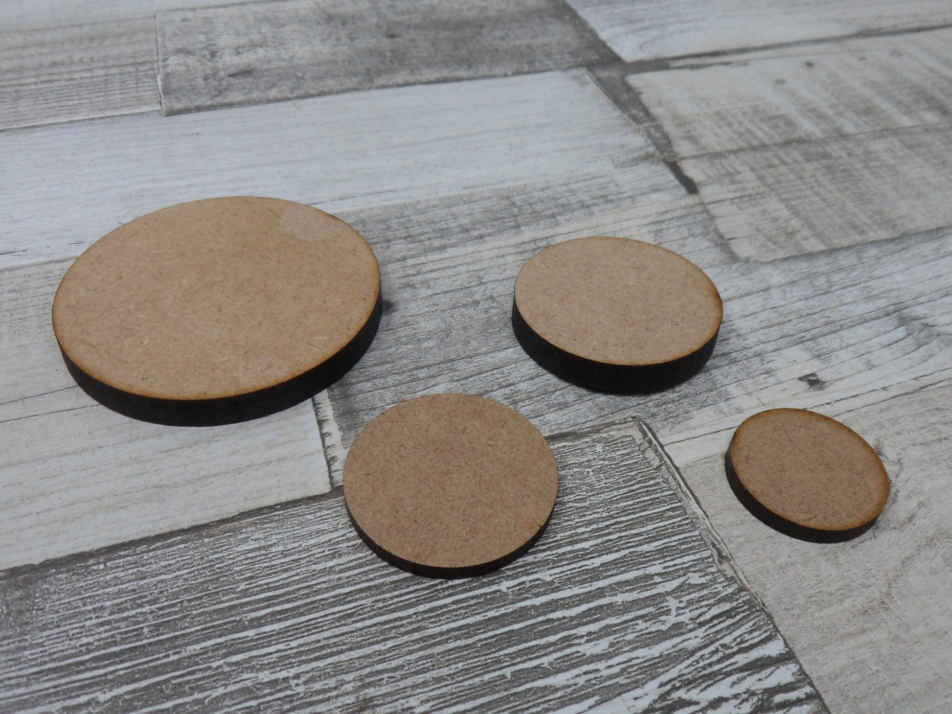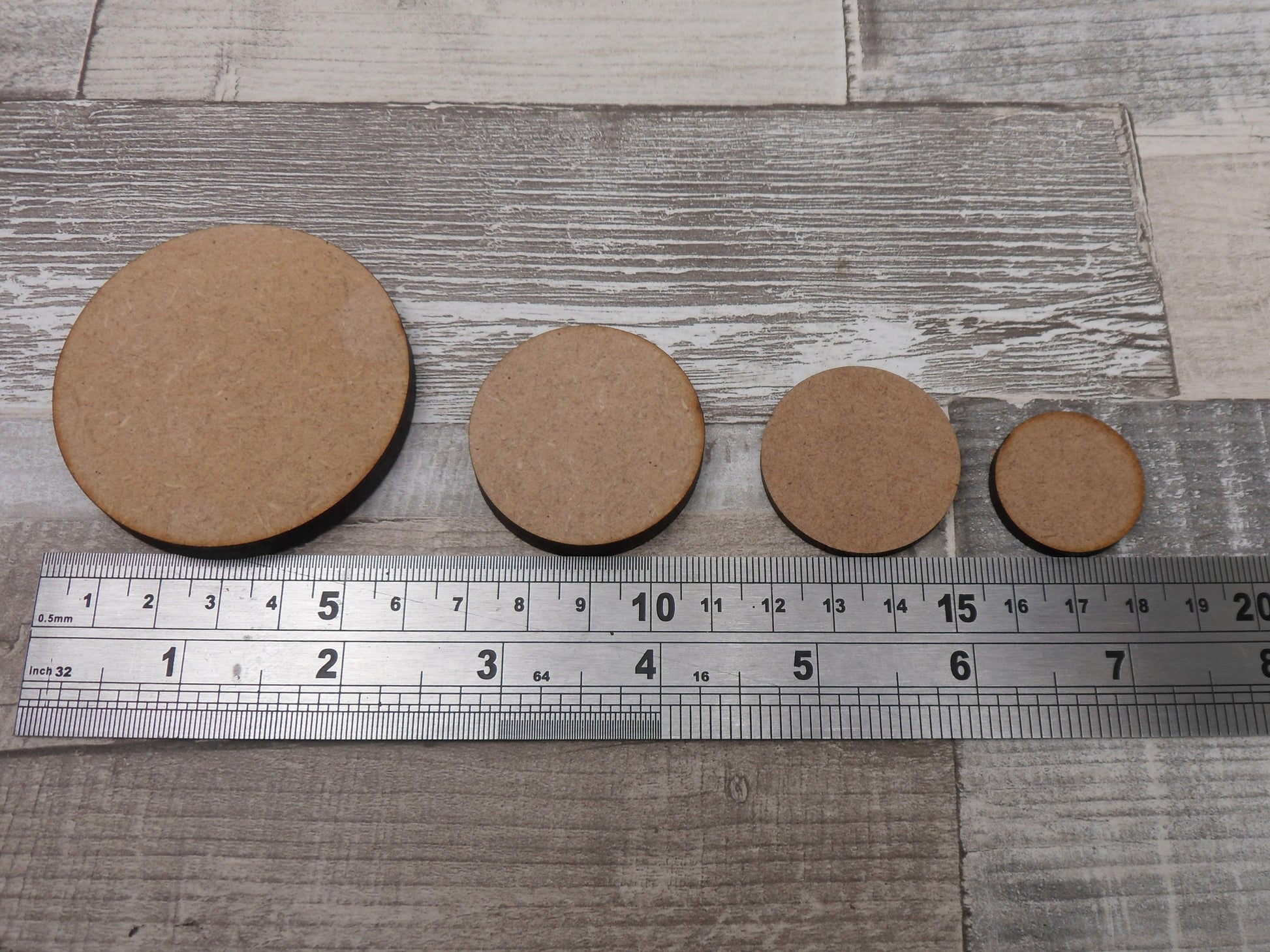 The most common sizes will be 25mm diameter on 3mm MDF 34mm diameter on 3mm MDF 53mm diameter on 6mm MDF 60mm diameter on 6mm MDF