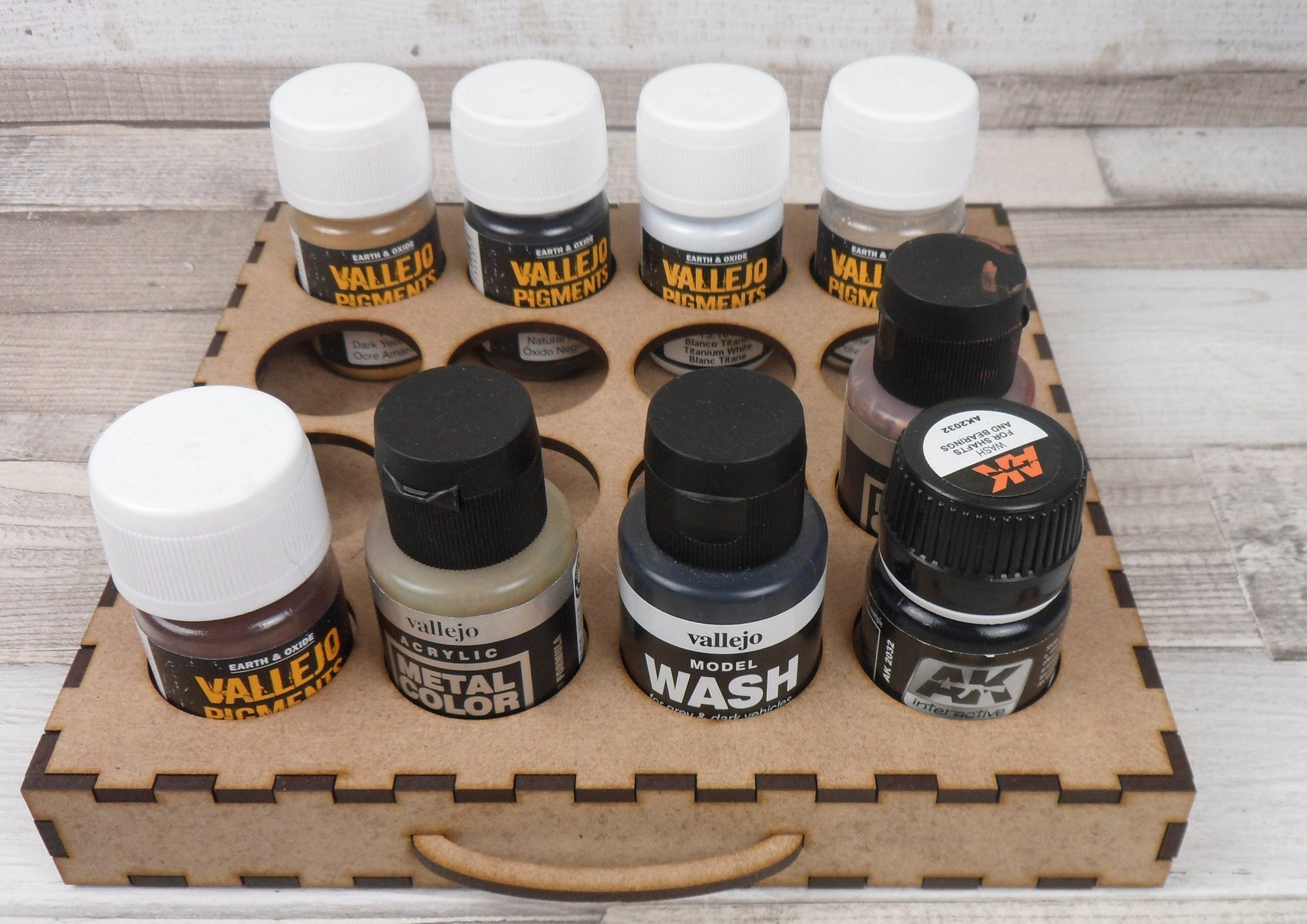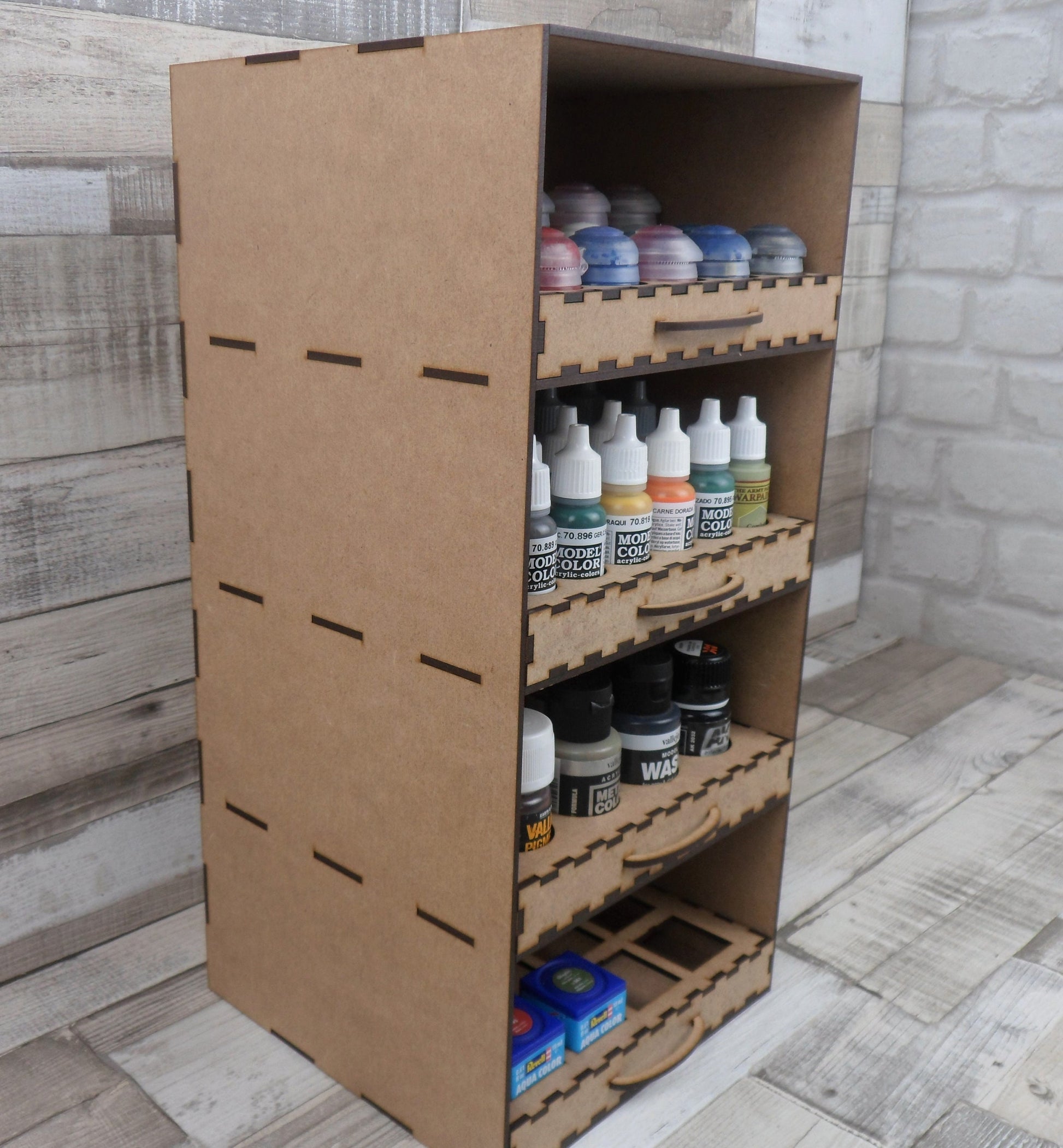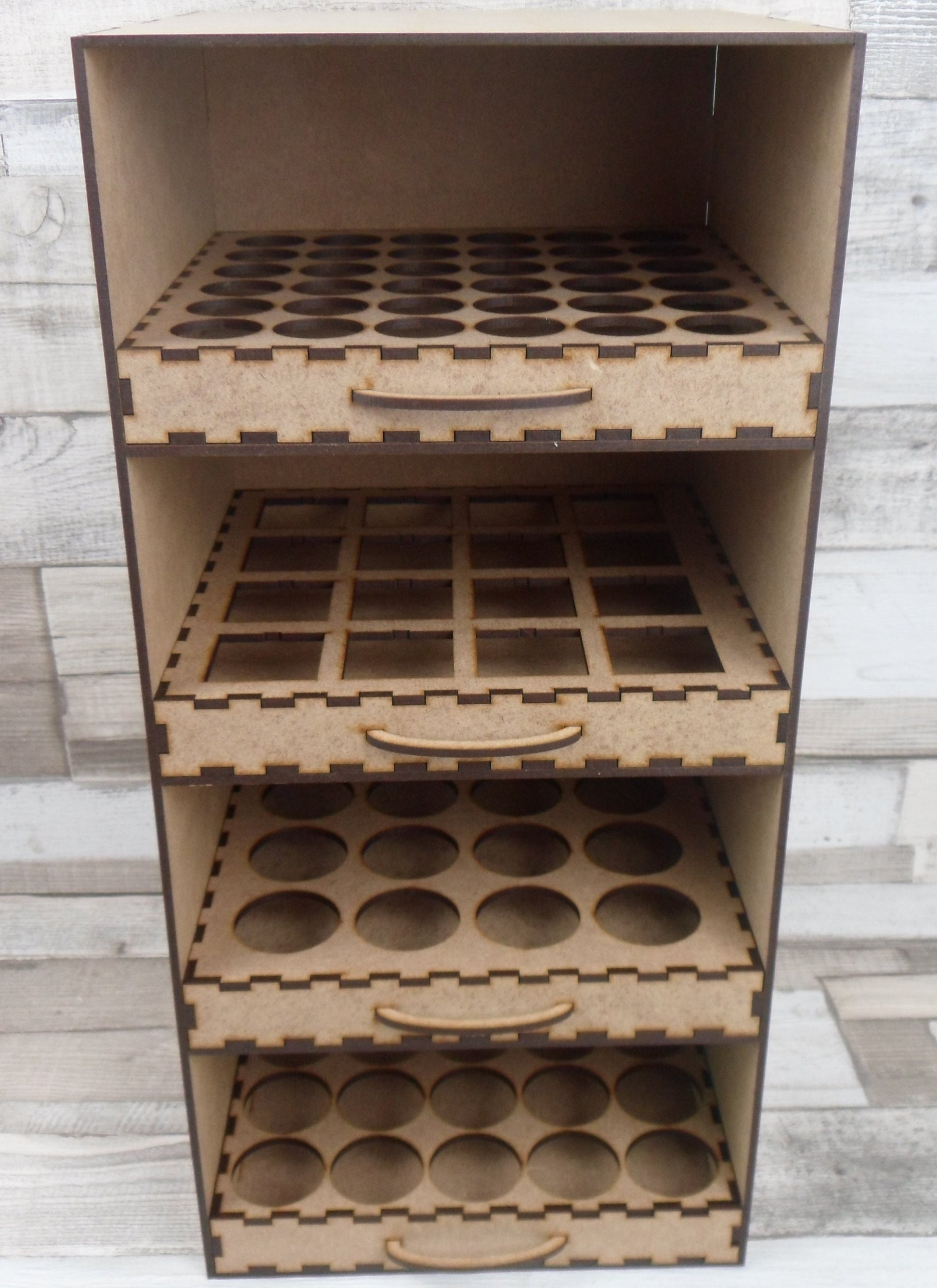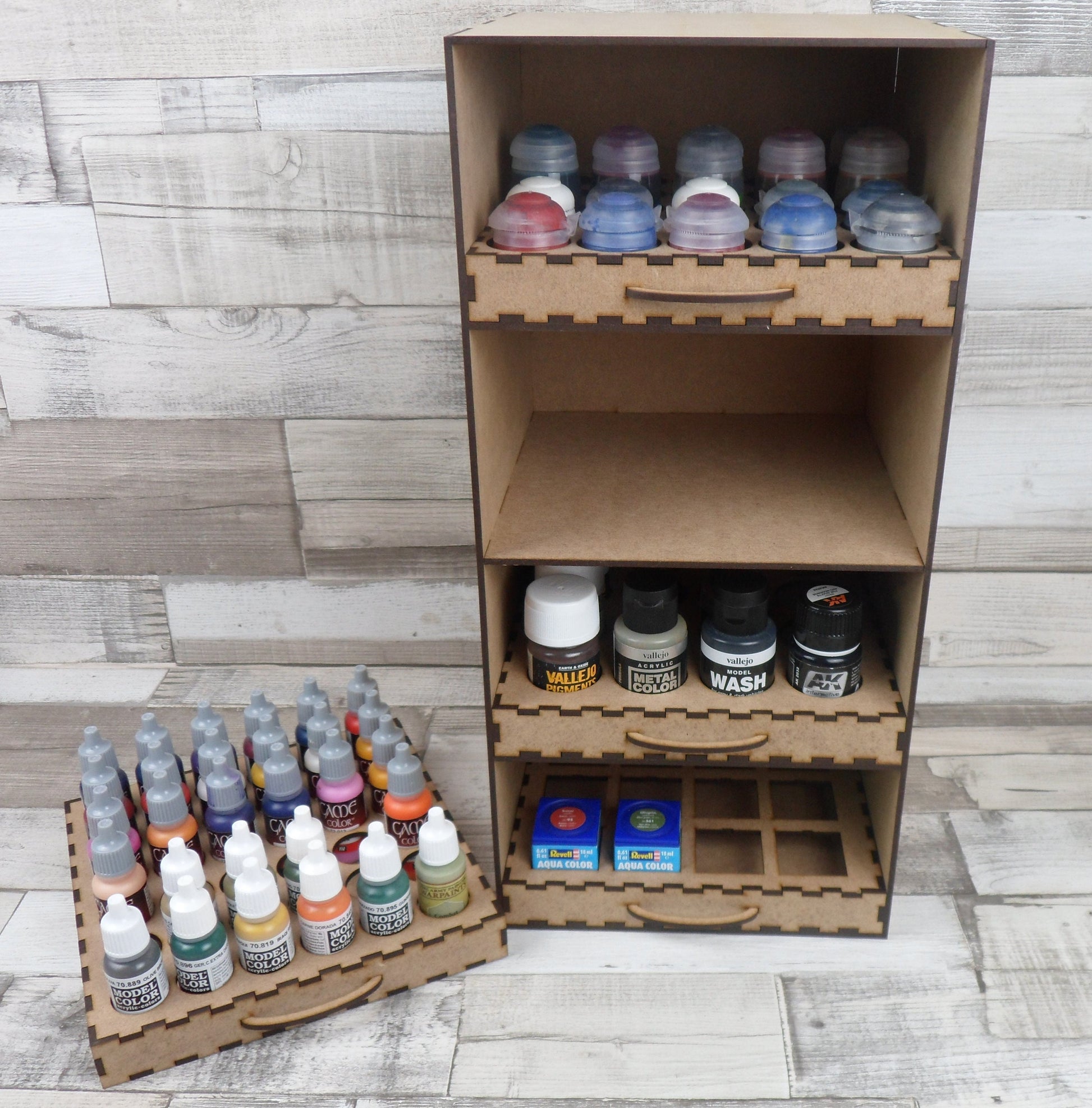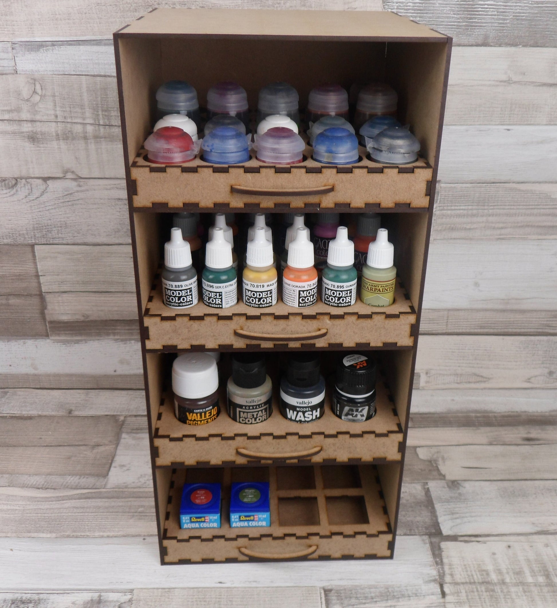We have 4 types of drawers available for most major brands of paints. And you can mix and match what drawers you would like from the drop down boxes above. Depending on what type of paints you have. Citadel/ Games Workshop Paint drawer can hold 25 citadel paints Vallejo/Army Paint. 25.5mm dropper bottle drawer can hold 36 dropper bottle paint pots Revell Aqua cam hold 16 Revell paint pots. Vallejo model wash/ pigment, Ak interactive paint/ 36mm bottle paint drawer can hold 16 paint paints.