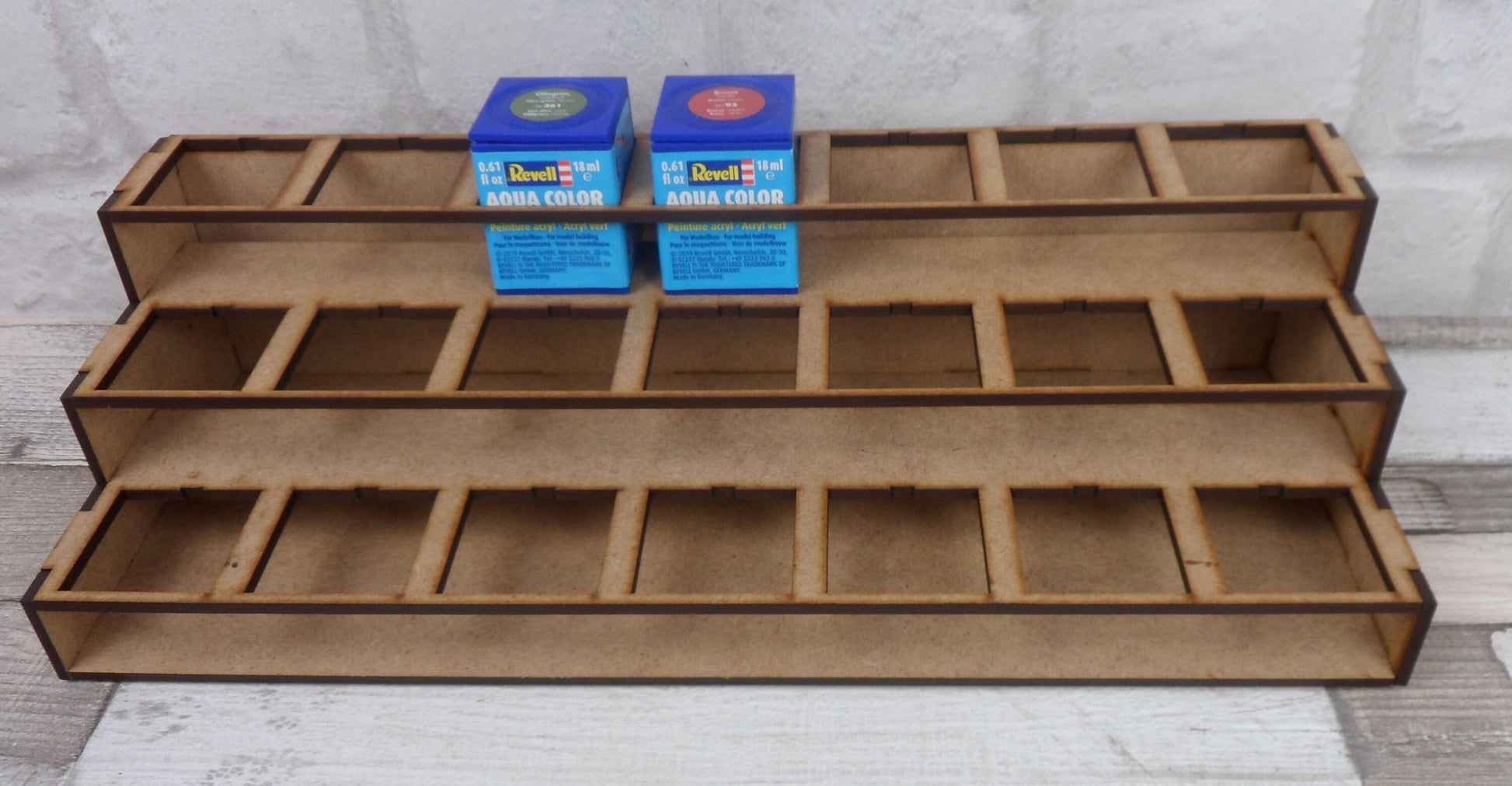 Revell Aqua paint stand, which can hold 21 paint pots on 3 tiers.