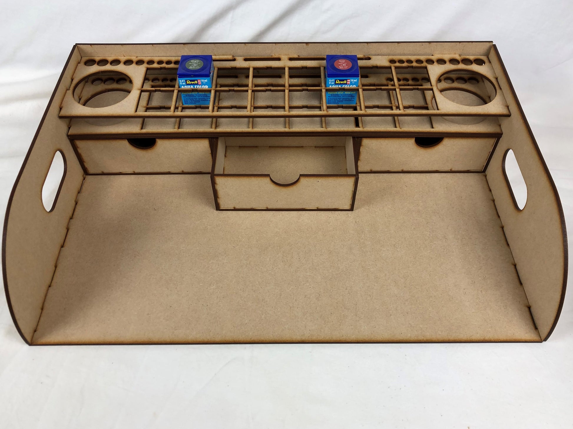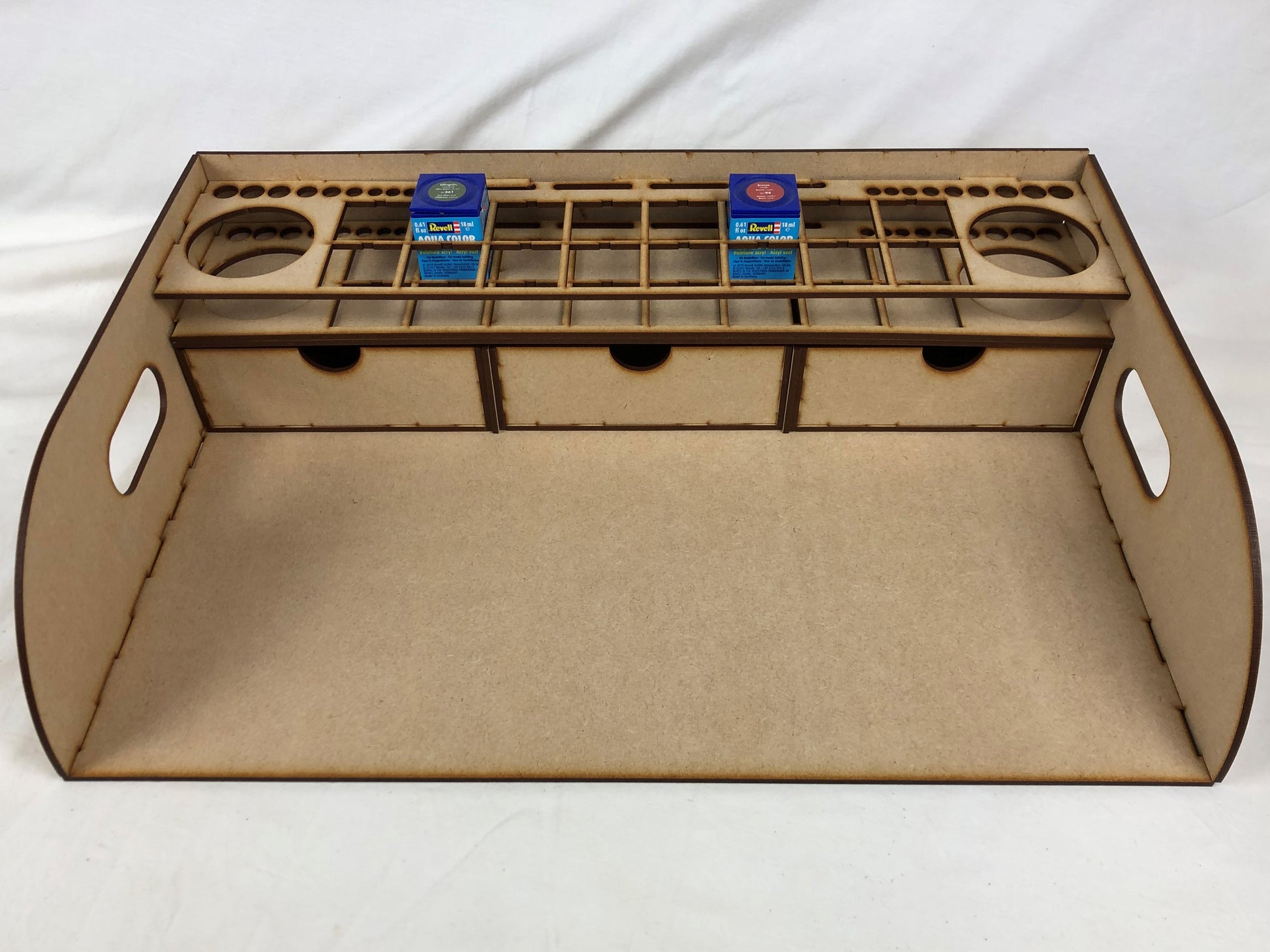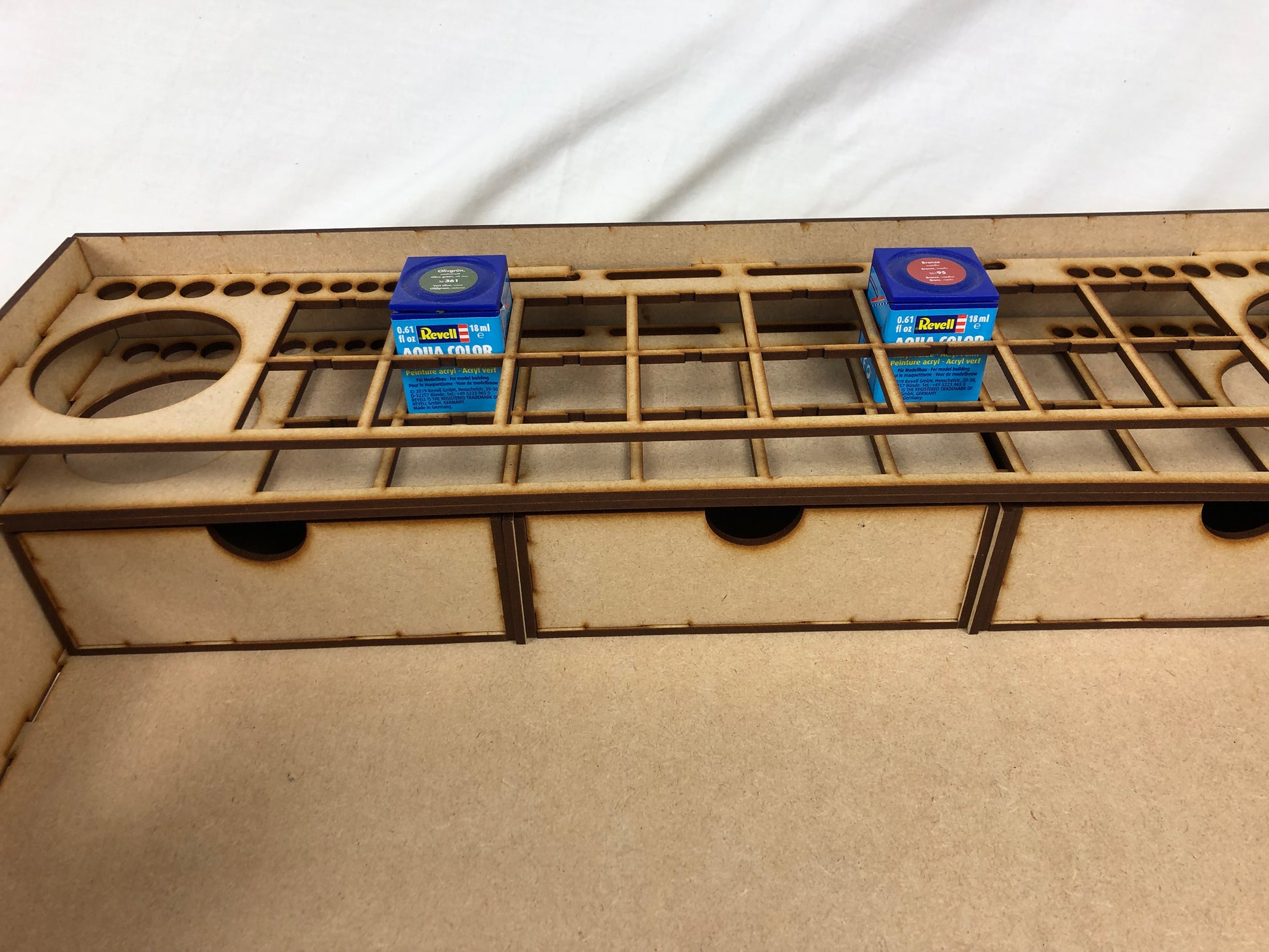 The workstation has room for 2 water pots, various sized paint brushes/ tools and also has 3 good sized drawers, to hold paint, glue or even models. and can hold 16 Revell Aqua paints.